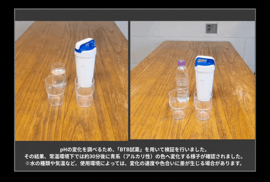 こちらは酸性の水から、セラミックボールを入れてアルカリ性になる実験の動画です。