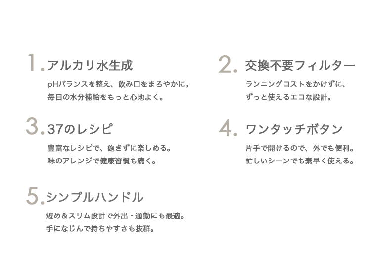 果物やハーブを加えたアルカリウォーター、カフェ風ドリンク、手軽なスープまで、毎日の気分に合わせてアレンジが可能です。
