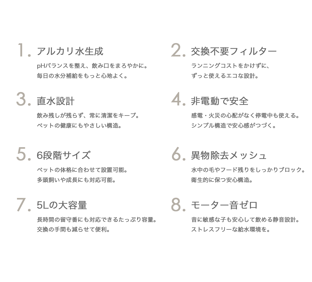 アルカリ水のまろやかな口当たりと、自然な飲水行動をサポートする設計がその理由です。