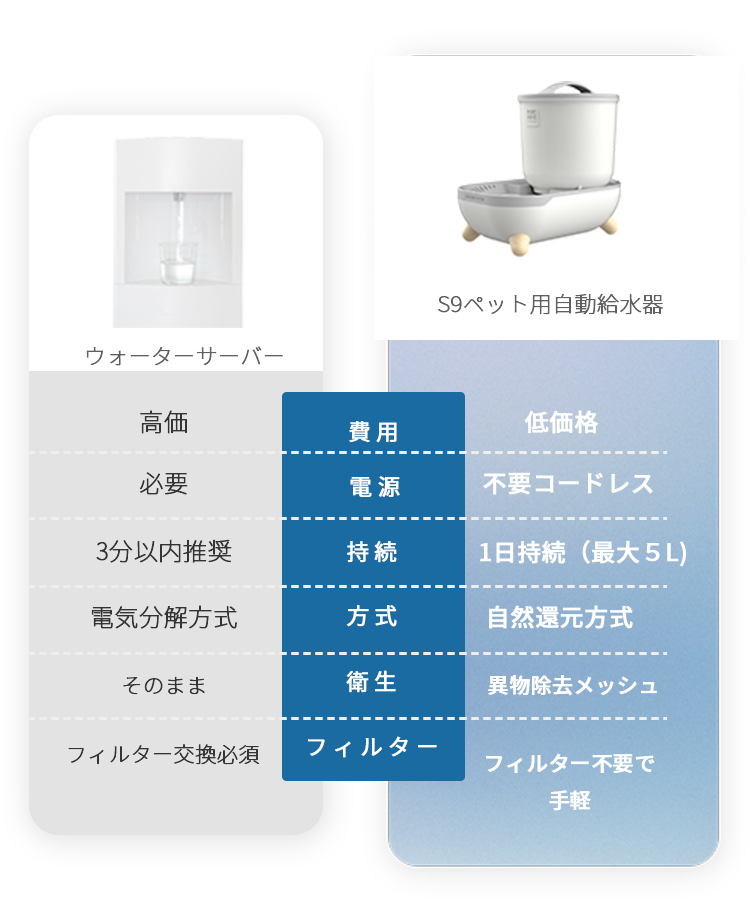 多くの自動給水器は「再循環式」ですが、S9は「直水式」。